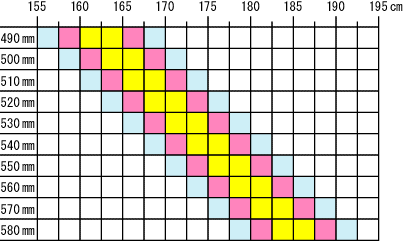 ロードバイク最後にロードバイクの適正サイズ選びです。 各自転車メーカーは、実際に出来上がった自転車を色々な身長の人間に乗せて、 ここからここまでなら乗れます。と言う事で 「乗車身長」、「推奨サイズ」 などとカタログに記載しますが、 実際の所は股下、胴、腕の長さは人それぞれ違いますし、好みの問題もあります。 身長の割に足が長く、胴と腕が短い方は適正サイズを購入しても サドルを目一杯前に出してステムを短い物に交換する必要があるかも知れませんし、 足が短くて胴と腕が長い方はサドルを目一杯後に下げてステムを長くする必要があるかも知れません。 お客様の身長が適正サイズ(最下表の黄色部分)の中間に収まっていれば ハンドルからサドルの距離を+-5cm程度変更できる許容範囲が残っておりますので、 殆どの場合サドルの調整だけか、+ステムの交換程度でベストなポジションが得られると思いますが、 ギリギリの物を買ってしまうと許容範囲が残っていない為に、乗り方が変わった時や、 ポジションに納得が行かなくなった時は自転車を買い換える事になってしまうかも知れません。
